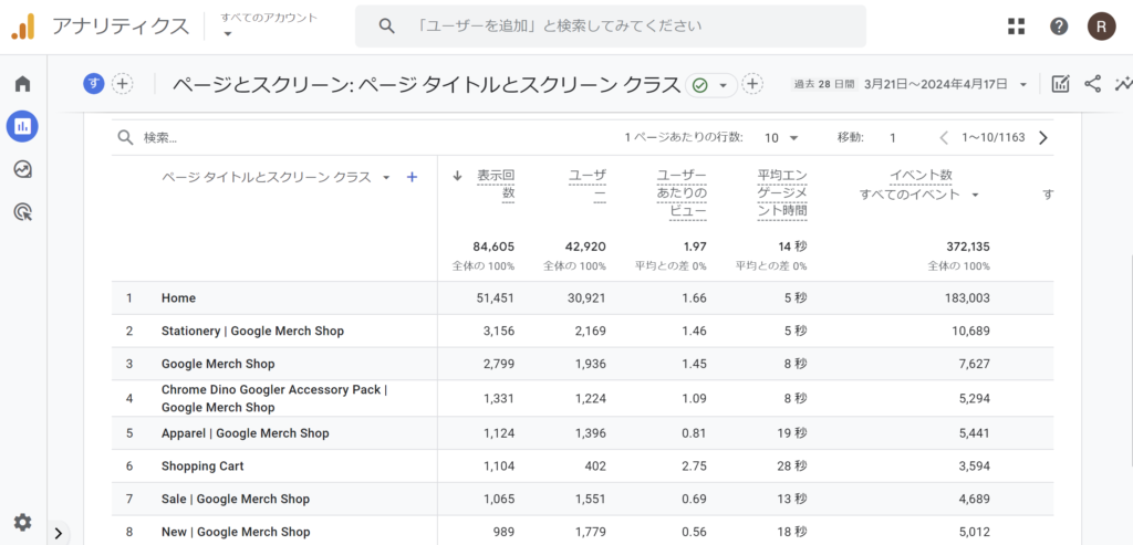 表示回数(PV数)、アクティブユーザー、アクティブユーザーあたりの表示回数などなどを、ページごとに確認することができます。